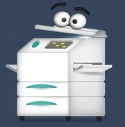 Coppy is a photocopier with a pair of glass eyes on his scanner lid. The eyelids to these eyes are a minty green. He has two trays, each having a green handle; he also has collapsible trays on both of his sides, which he moves to convey emotion. He also has two slim, floating black eyebrows for this purpose.